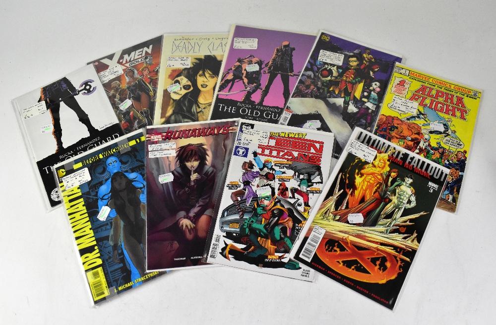 Lot 765 of 1434: Twenty Marvel and other comics including signed first editions and special covers to include, 1-4 2012 of 'Before Watchmen, Doctor Manhattan', 'X-Men' gold cover set, signed by J. Scott Campbell, DC 'Teen Titans' First App Crush, Lobo's Daughter (2018), with Alex Garner cover, Issue 1 'The Old Guard' 2017, 'Teen Titans First App, Crush Lobo's Daughter', 2018, `Ultimate Fall Out' 2011, Miles Morales partial preview, 'The Old Guard' first print 2017, 'Alpha Flight' first edition 1983, 'First Puck