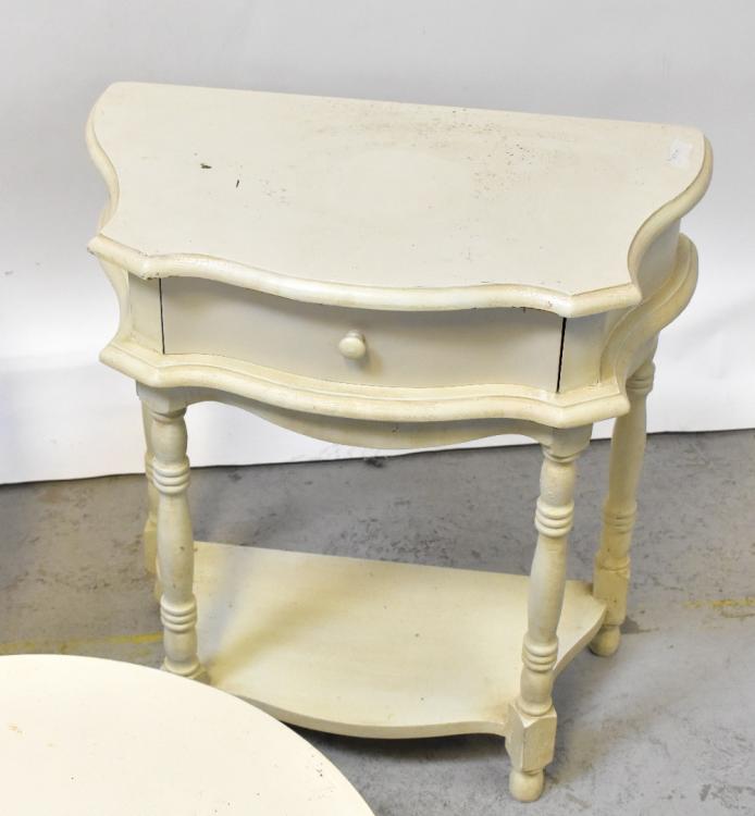 Lot 7 of 1032: A pair of white painted reproduction serpentine fronted single-drawer bedside tables, raised on turned and block supports united by an undertier, 68 x 61 x 34cm, also two small cream painted circular occasional tables, one with ball and claw feet (4).