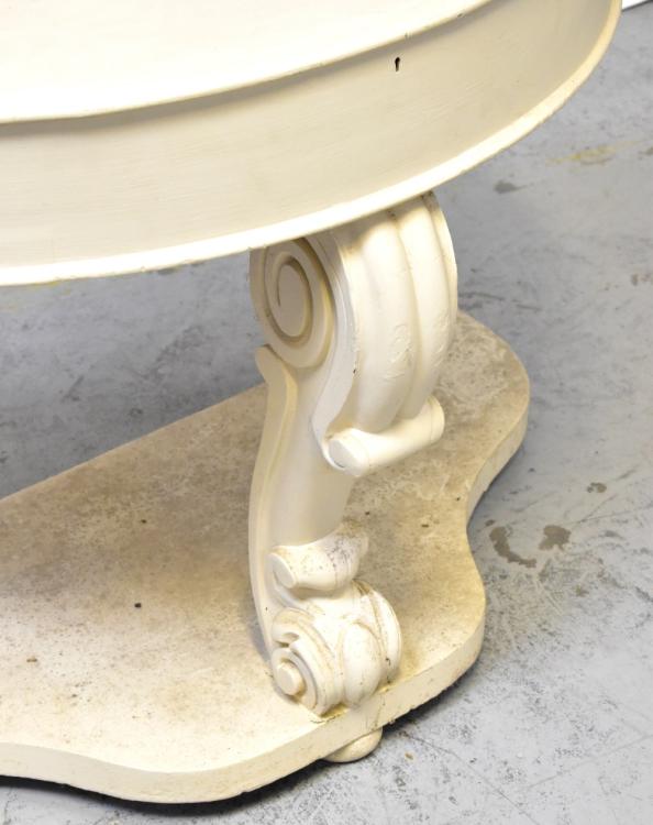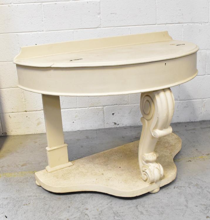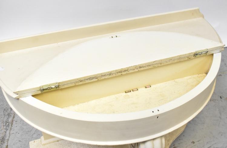 Lot 16 of 1032: A white painted demi-lune console table with partially hinged lid above ornately carved front leg and shaped undertier, 79 x 106 x 53cm.