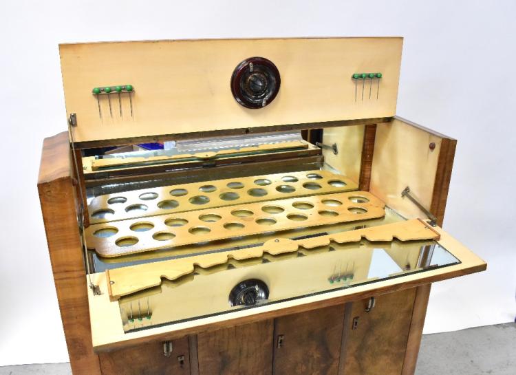 Lot 22 of 1032: An early 20th century walnut Art Deco style cocktail cabinet, the cantilever top enclosing a mirrored interior with a quantity of matched glasses, above a pair of panelled doors flanked by a further pair of panelled doors to plinth base, 118 x 107 x 42cm (af).