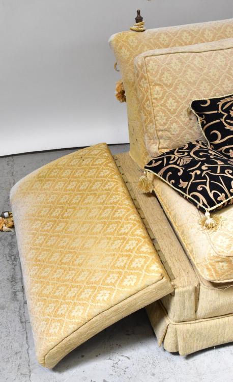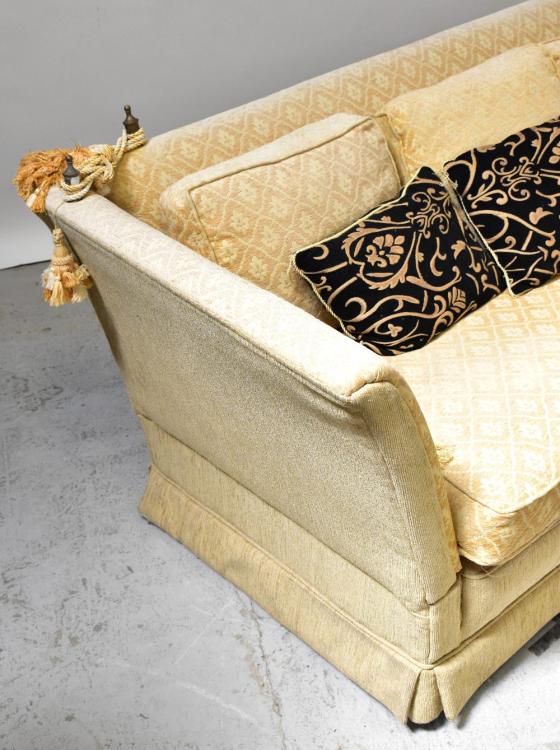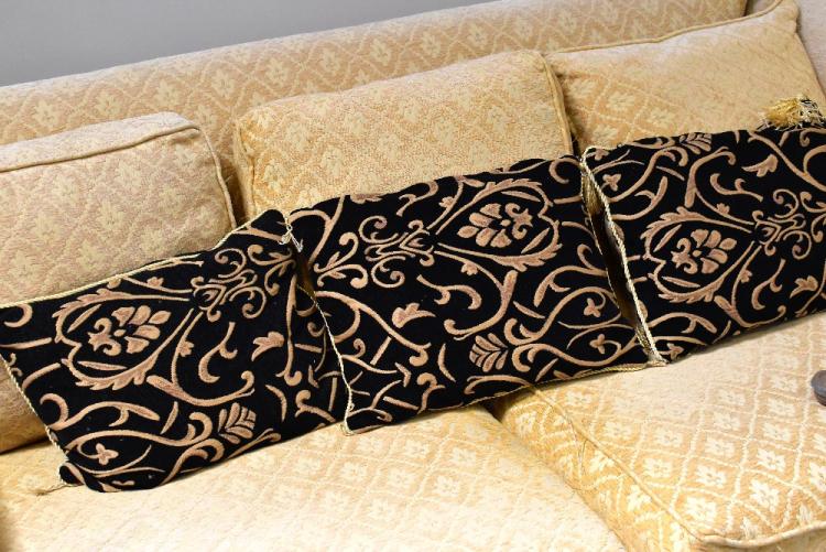 Lot 25 of 1032: DURESTA; a Knoll-style three-seater settee upholstered in beige damask-style fabric, with additional black and gold cushions.