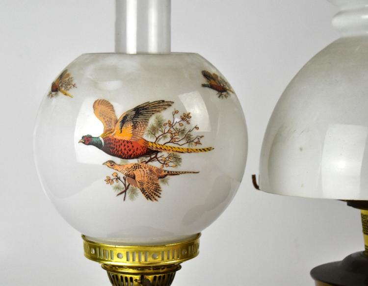 Lot 31 of 1032: A brass oil lamp with opaque globular shade decorated with pheasants in flight, height 46cm and a similar undecorated example (2).