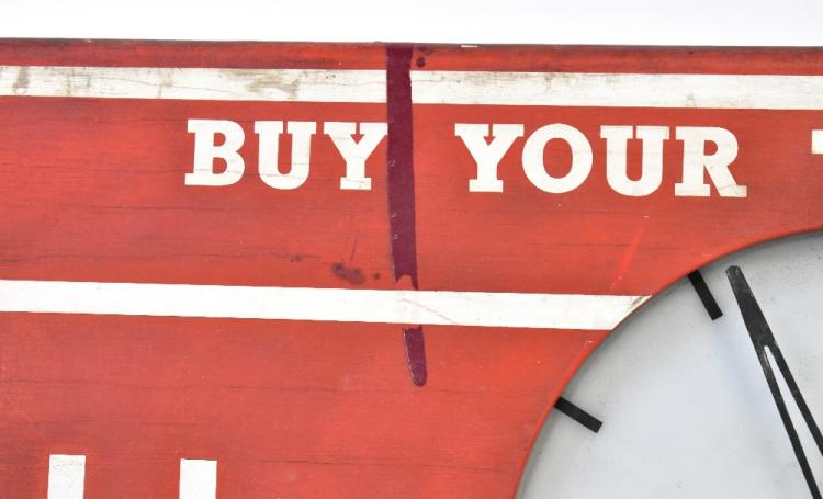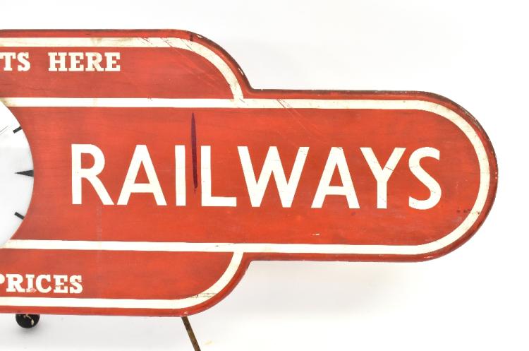 Lot 52 of 1032: BRITISH RAILWAYS; a wooden totem clock sign, the red and white screen printed clock inscribed 'British Railways - Buy Your Tickets Here at Station Prices', with original movement and fittings, dimensions 31 x 117cm, these clocks were usually found in British Railway accredited travel agents.