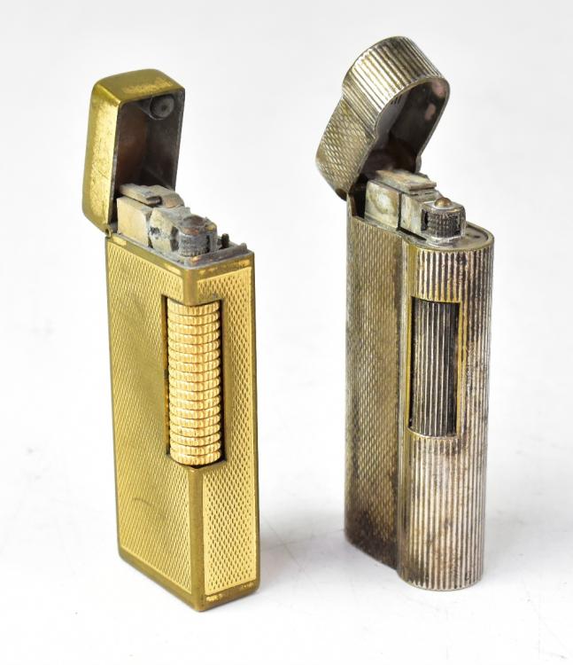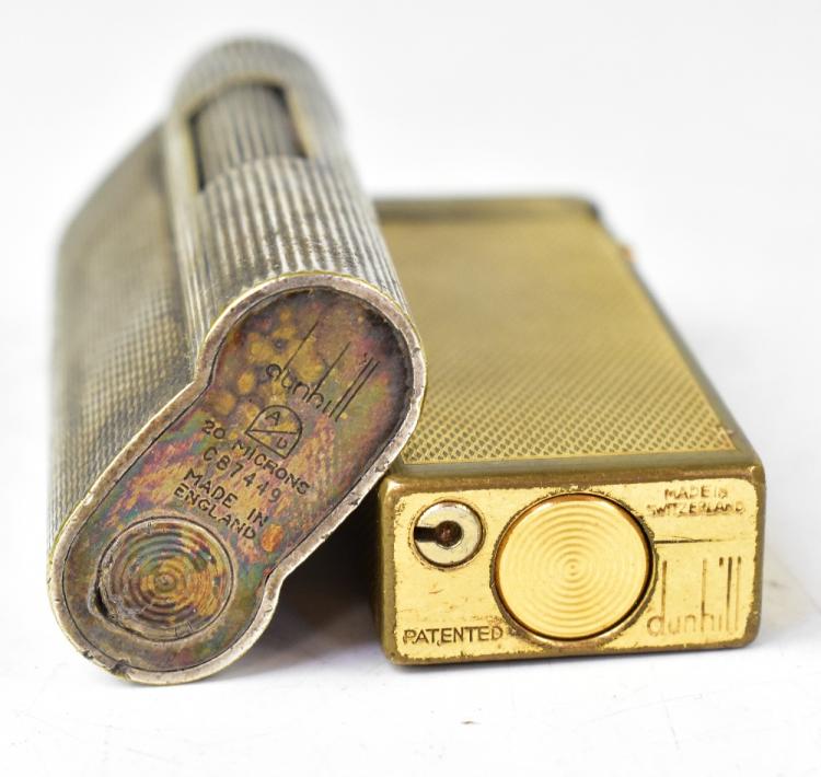 Lot 54 of 1032: DUNHILL; two lighters comprising a yellow metal engine turned example and a similar silvered example, length 6.6cm (2).