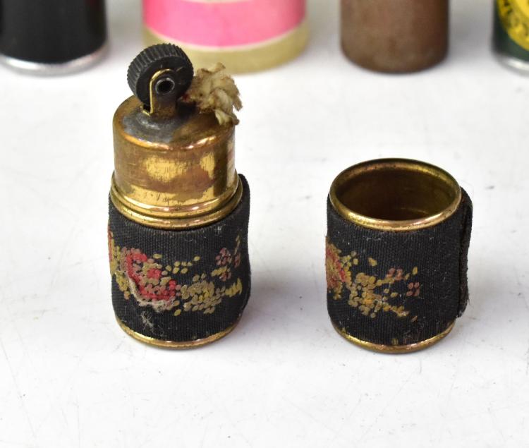 Lot 59 of 1032: Six novelty lighters in the form of bottles including Budweiser, height 8cm, Guinness and Tolleys Brandy, also a lipstick lighter with tapestried case stamped 'West Germany' (7).
