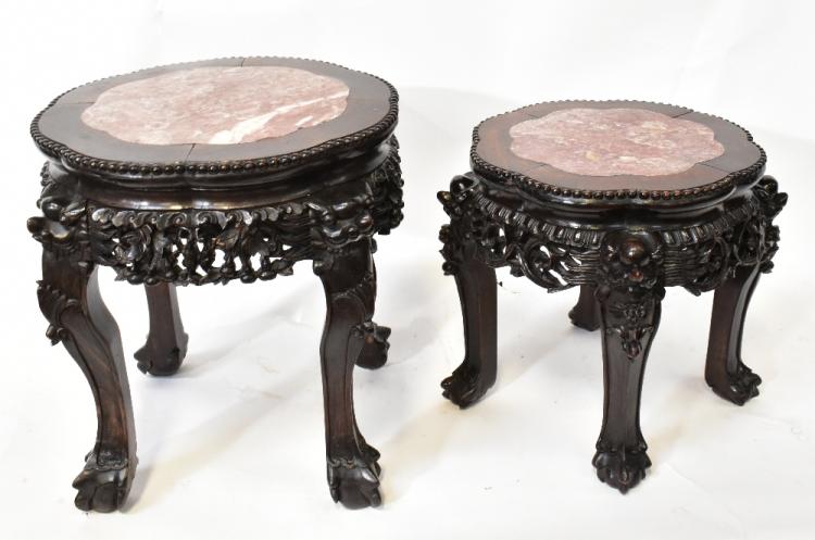 Lot 22 of 1354: Two Chinese carved hardwood and marble inset low tables or stands, each with carved dragon head and pierced apron of leaves and berries, raised on shaped legs and ball and claw feet, heights 46cm and 38cm, diameters 41cm and 37cm (2).