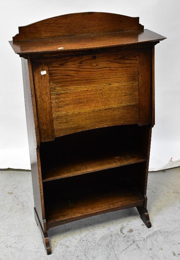 Lot 56 of 1354: An early 20th century oak student bureau, the arched raised back above bow front top and fall front with an assortment of pigeonholes to the interior, above a pair of open shelves, to bracket feet, 124 x 75 x 25cm.