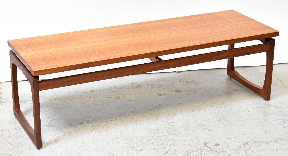 Lot 60 of 1354: G-PLAN; a 1960s teak rectangular coffee table with stylised end supports, 42 x 137 x 46cm.