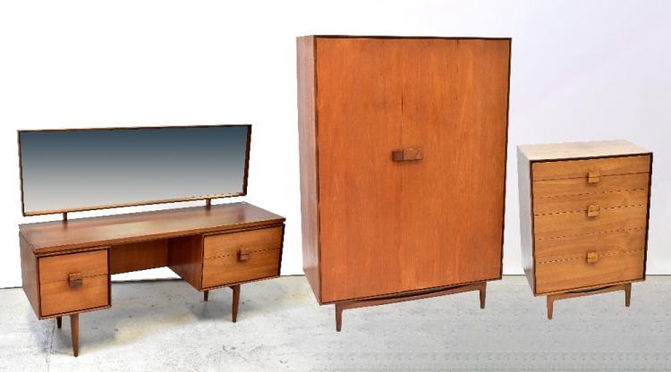 Lot 61 of 1354: G-PLAN; a 1960s teak three-piece bedroom suite comprising triple wardrobe, mirror back dressing table with stool and six-drawer chest (4).