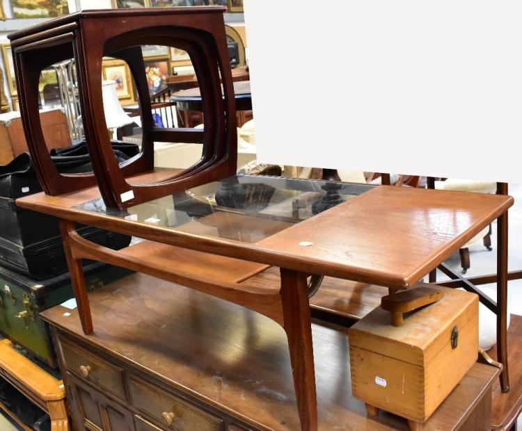 Lot 64 of 1354: G-PLAN; a 1960s retro teak coffee table with partially inset glass panel to the top above a narrow open shelf undertier, raised on tapering supports, 43 x 137 x 51cm, also a nest of G-Plan style stained teak tables, each set with bevel edged smoked glass, largest 51 x 48 x 48cm (2).
