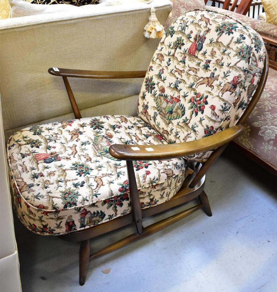 Lot 66 of 1354: ERCOL; a retro stained teak low comb back open arm lounge chair.