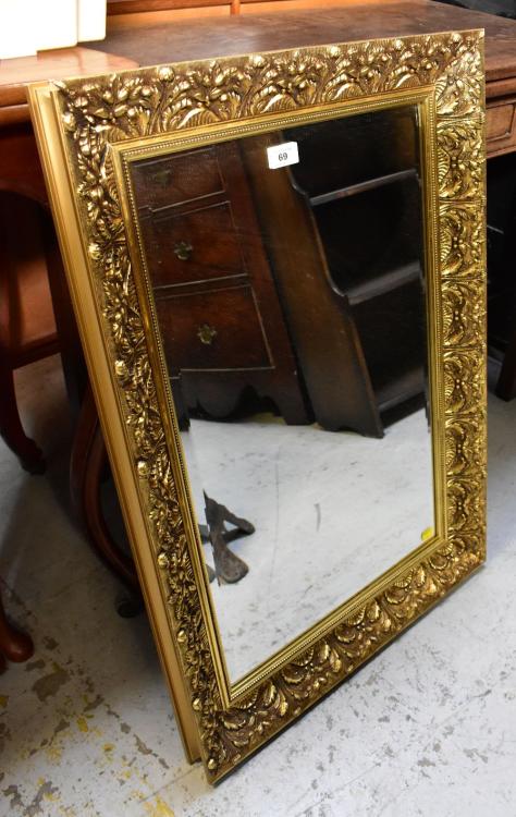 Lot 69 of 1354: A modern rectangular bevel edge wall mirror in an ornate carved wood gold painted frame, overall approx 80 x 57cm.