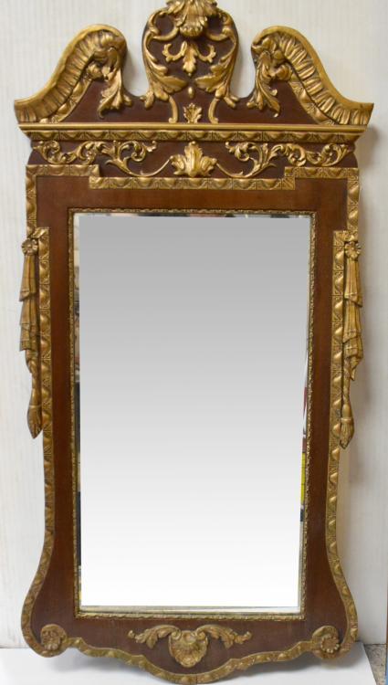 Lot 71 of 1354: A Rococo-style mirror with gilt-heightened mahogany frame with acanthus scroll and swag decoration, 107 x 55cm.