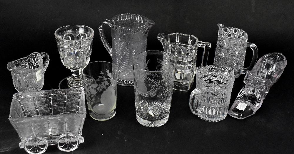 Lot 288 of 1354: A collection of 19th century clear pressed glass, mostly from the North East, to include goblets, jugs, commemorative etched glass tumblers, ornamental shoes and coal wagon, a cup 'Just A Thimble Full' etc, height of tallest 17cm. Footnote: This is all from the collection used by Mr Mason for his thesis about North Eastern Glassware and includes George Davidson & Co, Sowerby, John Derbyshire, Henry Greener & Co, etc.