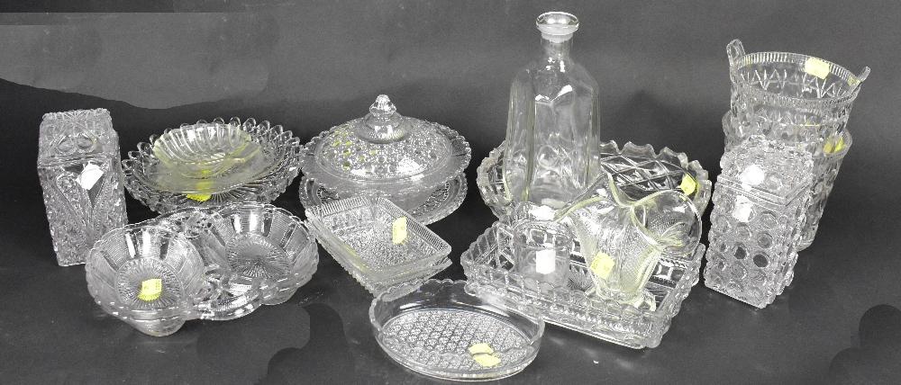 Lot 290 of 1354: A large collection of 19th century clear, pressed and moulded glassware, mostly from the North East, some with registration marks, to include table sets, clear and lilac-coloured glass boat-shaped bowls, frosted and Greek key patterns, lidded jar, decanter, shell dishes, ice pails, etc. Footnote: This is all from the collection used by Mr Mason for his thesis about North Eastern Glassware and includes George Davidson & Co, Sowerby, John Derbyshire, Henry Greener & Co, etc.