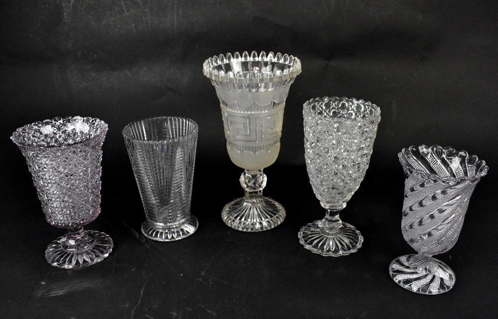 Lot 291 of 1354: A collection of ten 19th century pressed and moulded glass celery vases of varying size, design and colour, mostly from the North East, tallest 29cm (10). Footnote: This is all from the collection used by Mr Mason for his thesis about North Eastern Glassware and includes George Davidson & Co, Sowerby, John Derbyshire, Henry Greener & Co, etc.