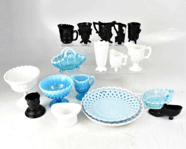 Lot 292 of 1354: A collection of 19th century pressed and moulded glass, mostly Sowerby, to include white opaque pedestal bowl, top hat, two jugs, one with Scottish theme, a tapered vase with beaded decoration, a woven pattern plate, diameter 25cm, black glass to include a George Davidson match holder in the form of a pail, factory mark to base, three jugs, a shoe, a vase, also four pieces of blue opaque and clear glass to include a pedestal bowl, a jug, a small dish and a small basket (19). Footnote: This is