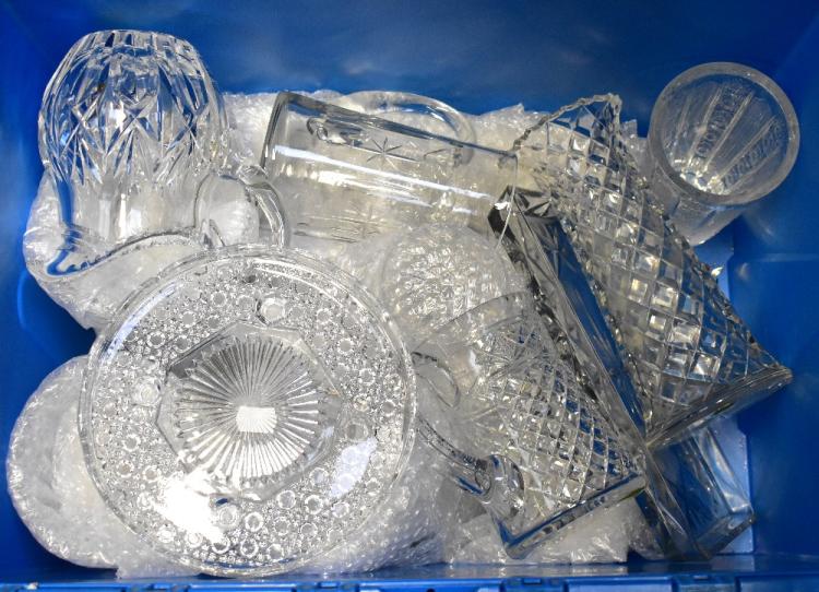 Lot 297 of 1354: A quantity of vintage and antique clear cut glass crystal to include a ship's decanter, height 22cm, a rectangular and circular tray, four cut glass vases of cylindrical shape, height of tallest 26cm and five cut glass and clear glass water jugs, height of tallest 19cm (13).