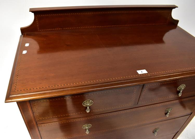 Lot 4 of 1102: An Edwardian mahogany with string inlay two-over-three chest of drawers, to tapering supports and castors, 106 x 97 x 48cm.