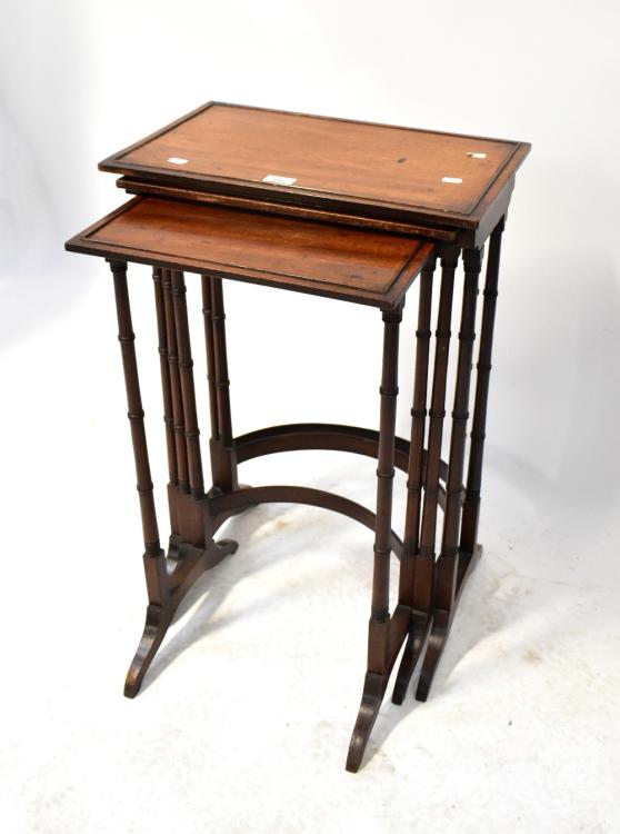 Lot 12 of 1102: An early 20th century mahogany nest of three tables to faux bamboo supports and curved cross-stretcher to each, the largest 72 x 51 x 34cm.