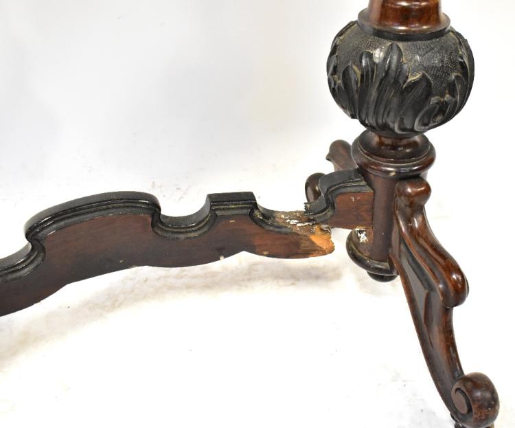 Lot 16 of 1102: A Victorian rosewood kidney-shaped occasional table with ebonised rim, raised on a pair of turned supports with carved bulbous detail, united by a shaped stretcher, raised on four outswept scrolling supports to castors, 77 x 92 x 51cm (af).