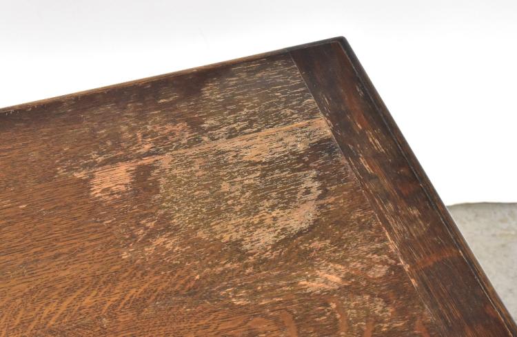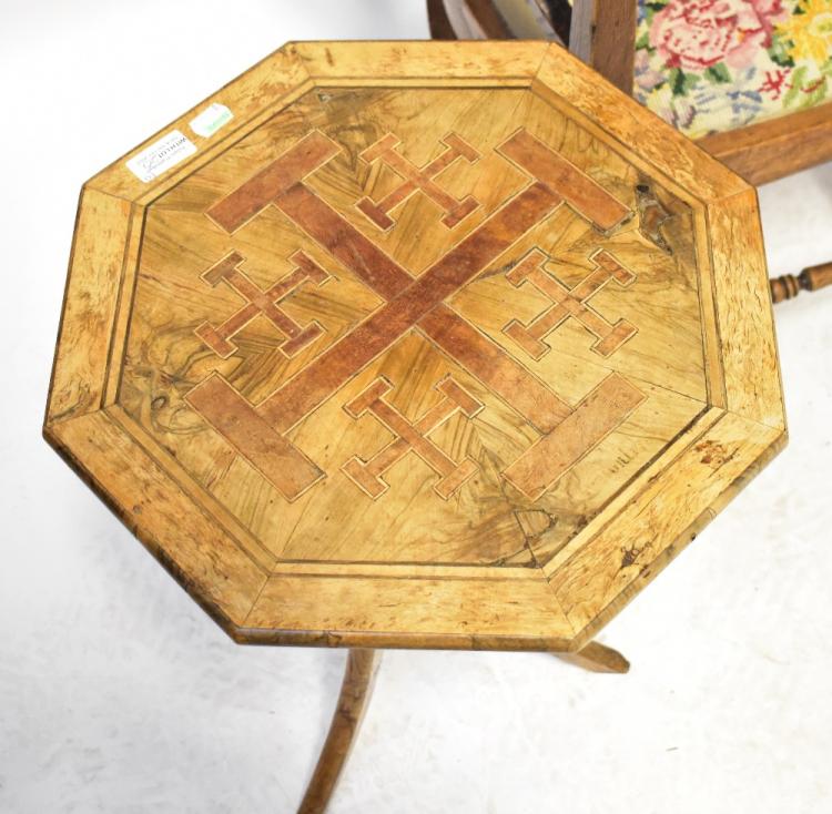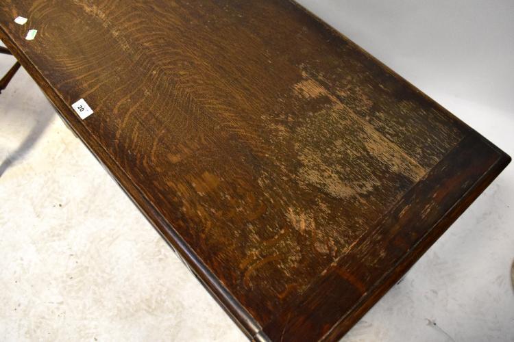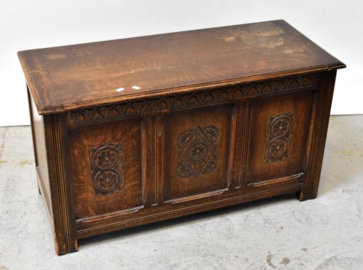 Lot 20 of 1102: A reproduction oak three-panel coffer, the hinged lid above carved frieze, three panels each with carved central panel, raised on stile supports, 59 x 104 x 46cm, also an oak framed corner chair with slatted back and upholstered drop-in seat, raised on square section cabriole stretchered supports, and a small hexagonal occasional table with inlaid motif to the top, raised on three outswept supports (3).