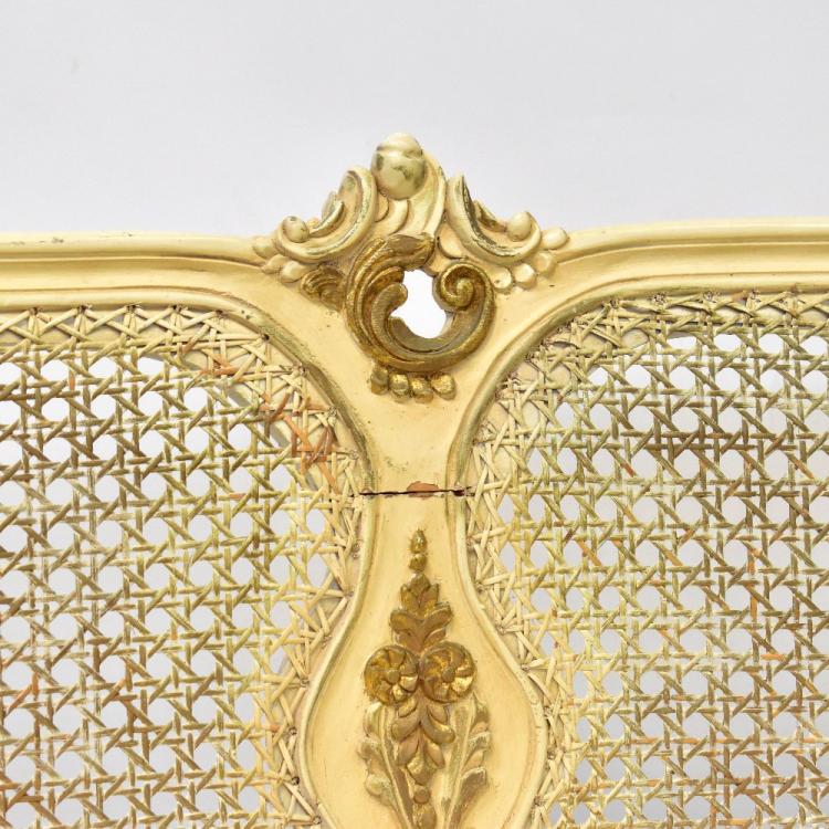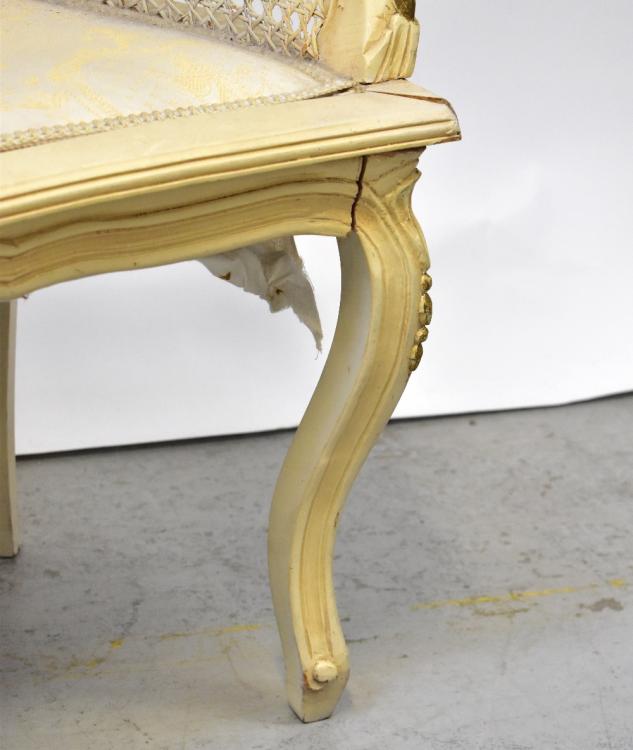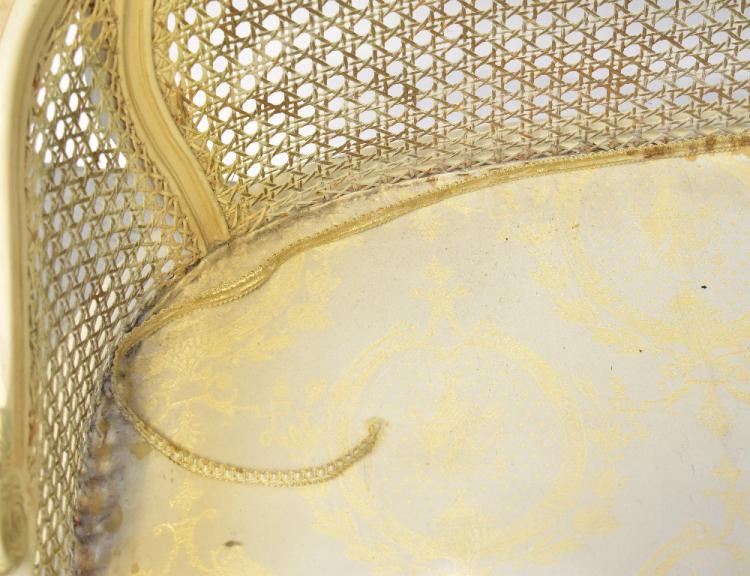 Lot 27 of 1102: A cream painted and gilt-heightened bergère caned two-seater settee, raised on cabriole supports to peg feet, 79 x 130 x 58cm.
