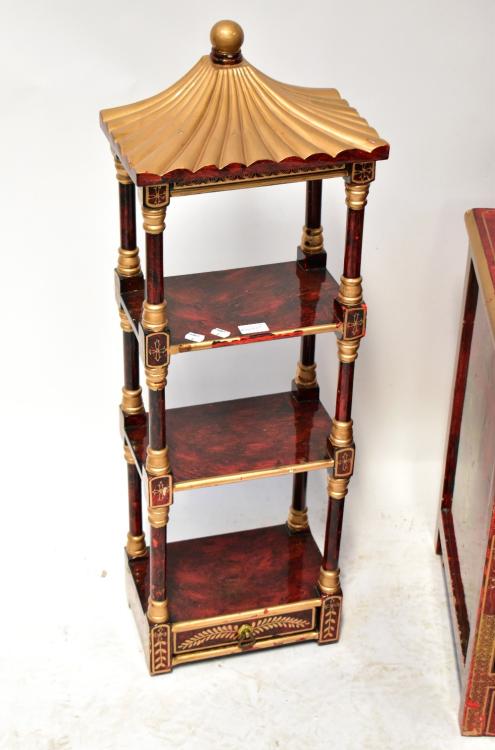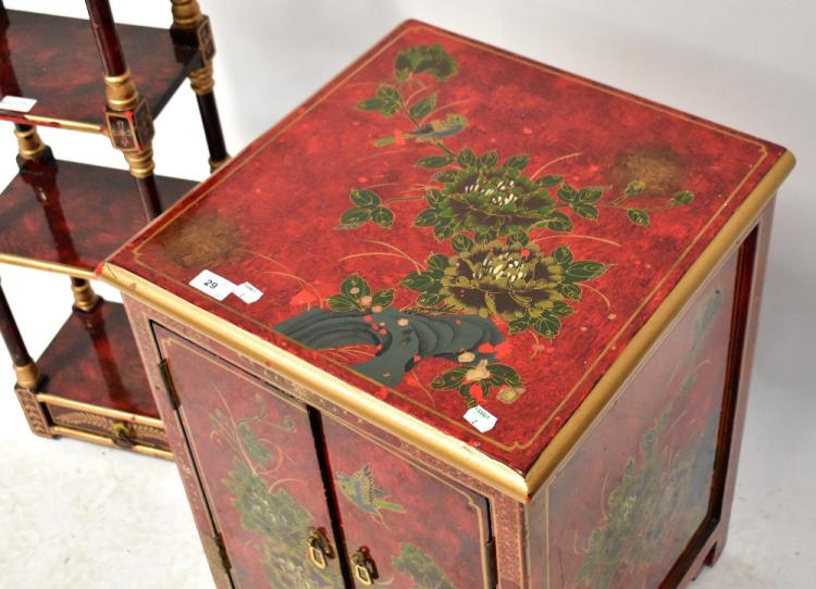 Lot 29 of 1102: A Chinese lacquered cabinet painted with chrysanthemums and birds on a red ground, together with a similar red and gold painted three-tier whatnot, height 19cm (2).