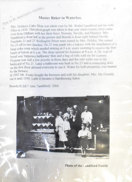 Lot 32 of 1102: A 1930s three-tier baker's stand on castors, painted in a green and blue finish, from Mrs Holden's Cake Shop in Waterloo, taken over by Master Baker Mr Walter Sandiford and his wife in 1934, this being Mr Sandiford's trolley from the shop in Wellington Street, Waterloo, 120 x 106 x 50cm.
