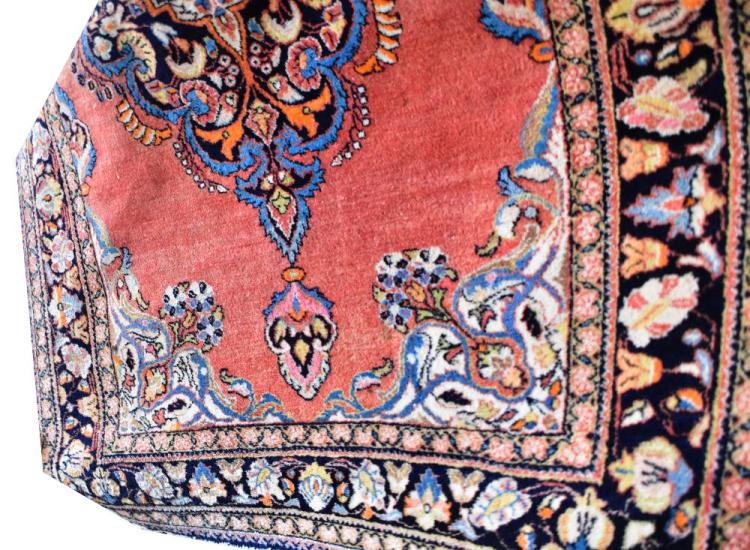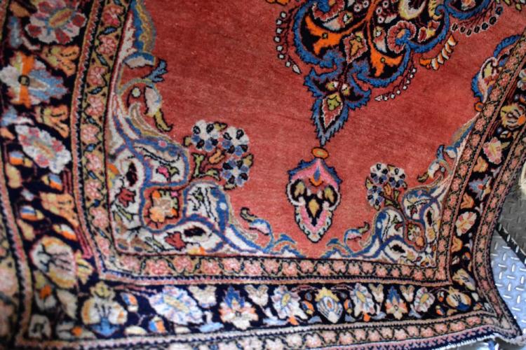 Lot 61 of 1102: A hand knotted terracotta ground carpet with central foliate medallion within stepped geometric border of flora and fauna, 203 x 148cm.