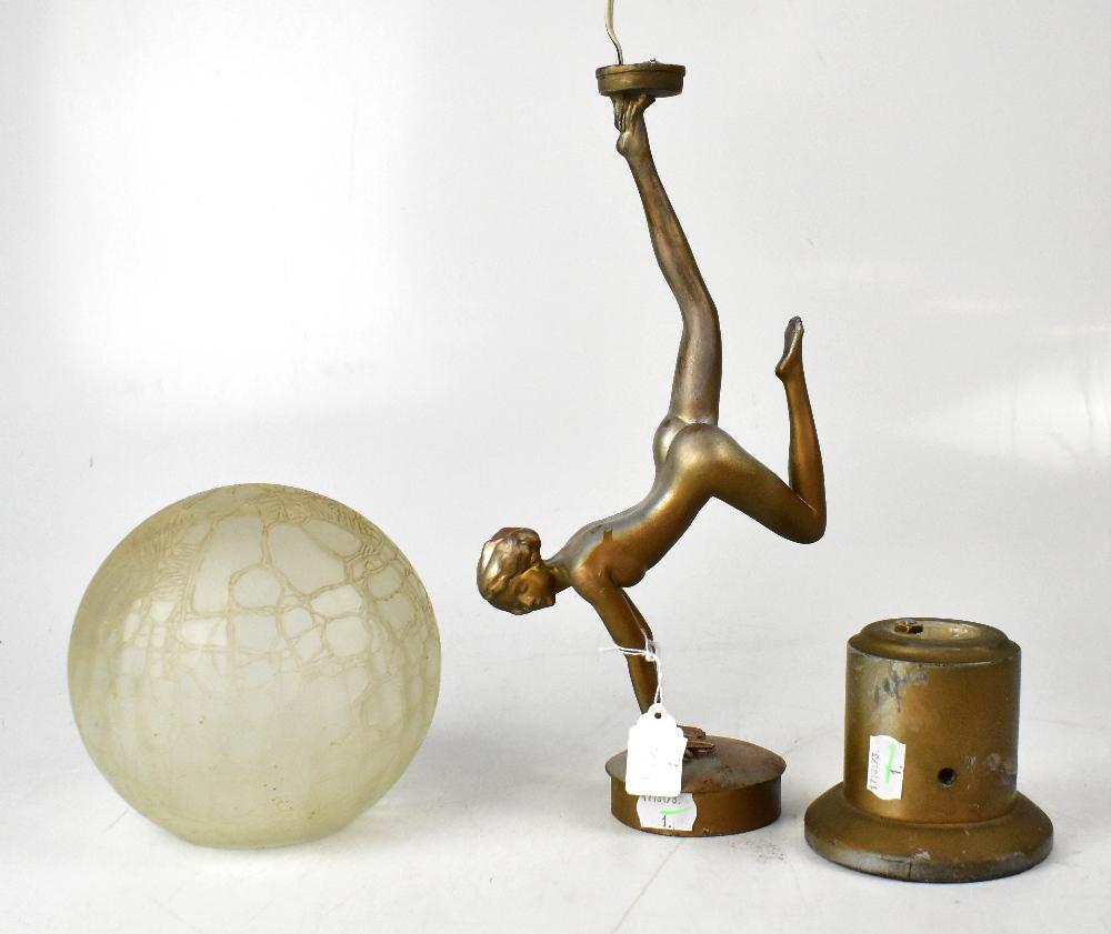 Lot 64 of 1102: An Art Deco style gilded table lamp modelled as a nude female, with crackle-effect globular shade, height 54cm.