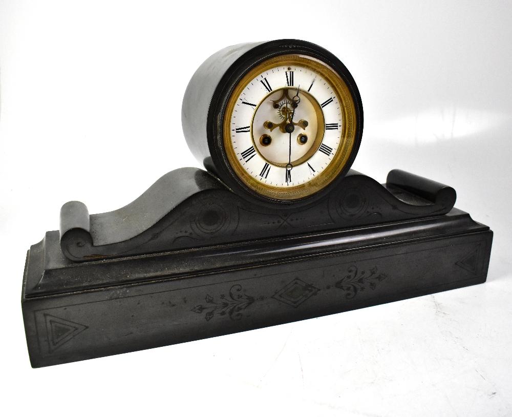 Lot 67 of 1102: A Victorian black slate mantel clock, the white enamelled dial set with Roman numeral chapter ring, with partially visible movement above a scrolling base to stepped plinth, 30 x 55 x 14cm.