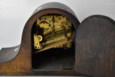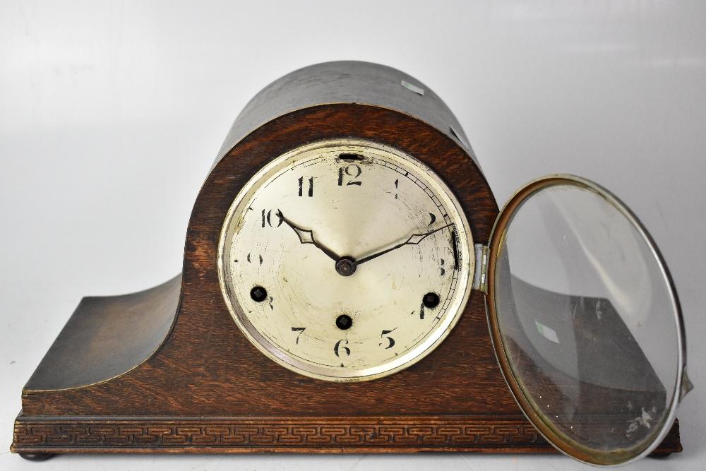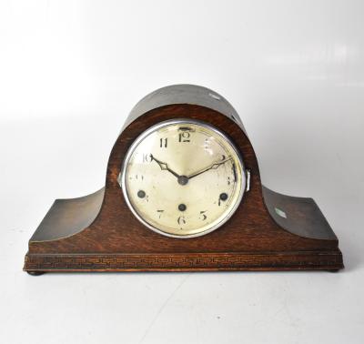 Lot 69 of 1102: An early 20th century oak cased chiming Napoleon hat mantel clock, the silvered dial set with Arabic numerals, above a Greek Key frieze, raised on squat bun feet.
