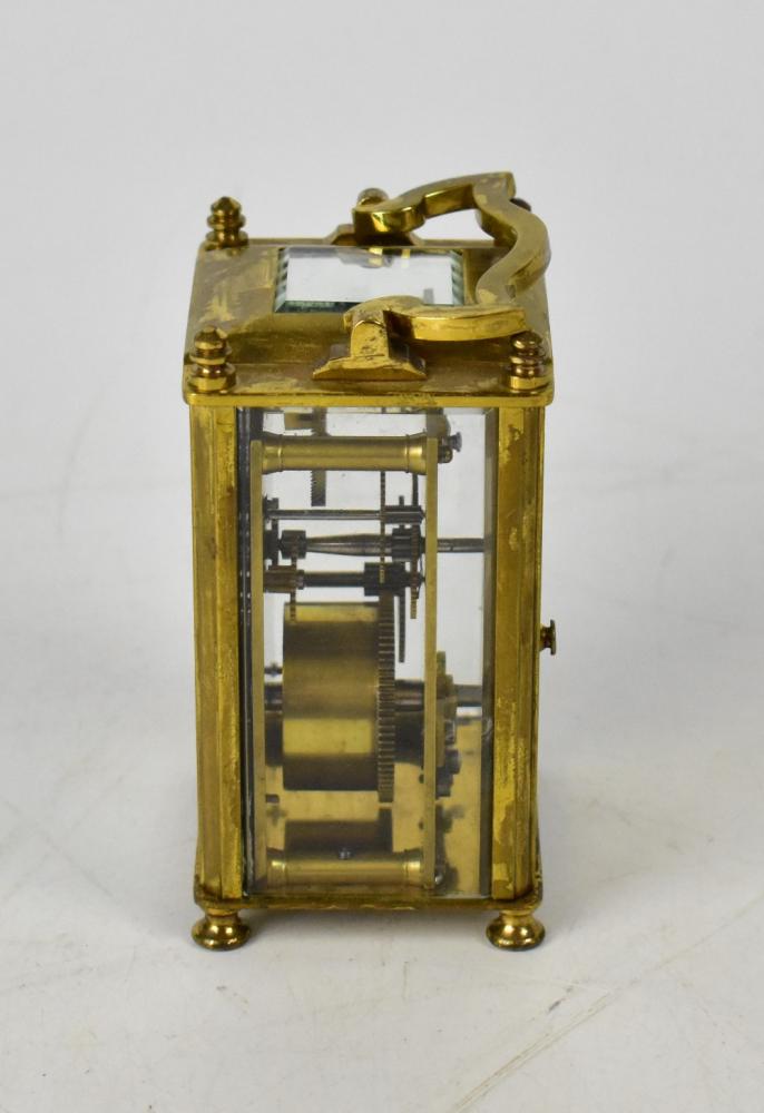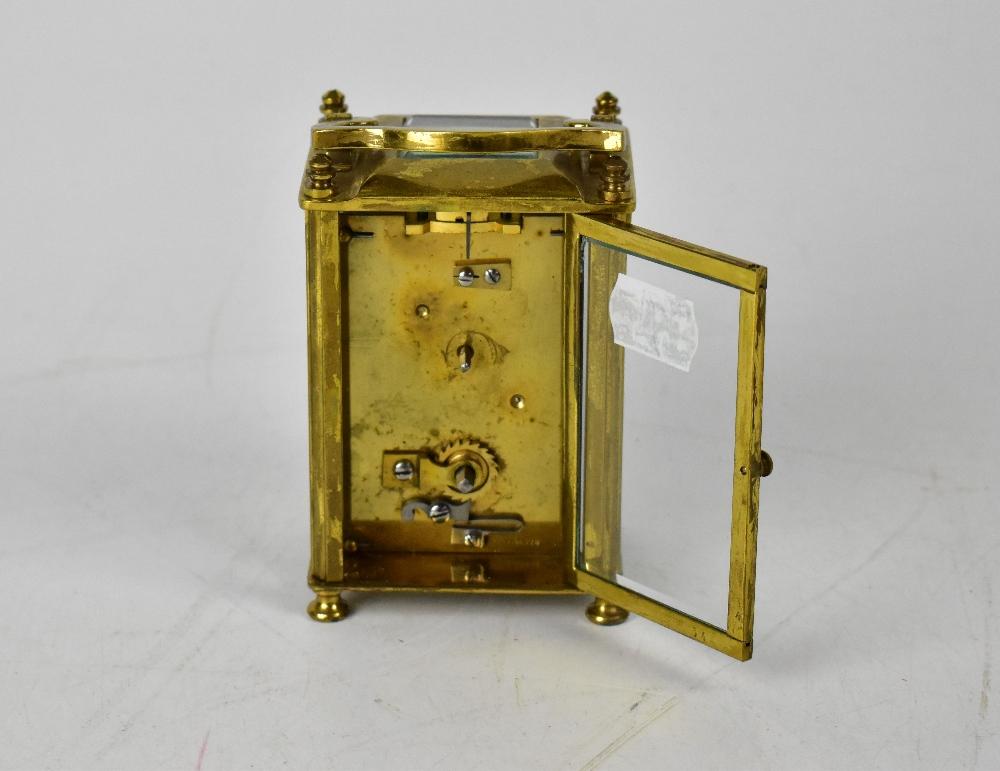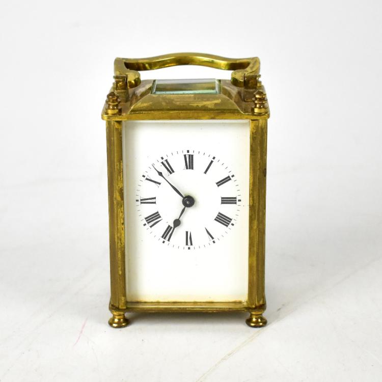 Lot 71 of 1102: An early 20th century French brass carriage clock, the white dial set with Roman numerals, crystal panel to the top with movement marked 'SRFA', with brass carrying handle and key, height approx 11cm, with original red leather and red velvet lined case.