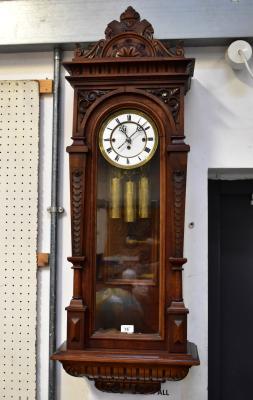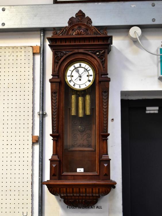 Lot 75 of 1102: An early 20th century walnut cased triple weight Vienna wall clock, the carved arched pediment above moulded cornice and arched glazed door, the white enamelled dial set with Roman numeral chapter ring, with fret carved back pane and incised decoration to the triple weight, striking on gong, height 123cm (lacking pendulum).