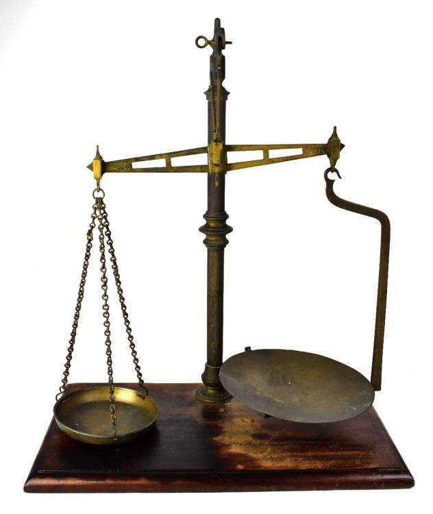 Lot 76 of 1102: PHARMACEUTICAL INTEREST; a set of early 20th century pharmaceutical scales, with brass stand and weighing pans, to a mahogany rectangular base, height 63cm, length 50cm. Provenance: This belonged to the vendor's father, who was a Liverpool pharmacist for many years from the 1950s onwards.