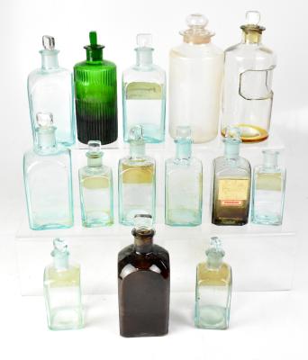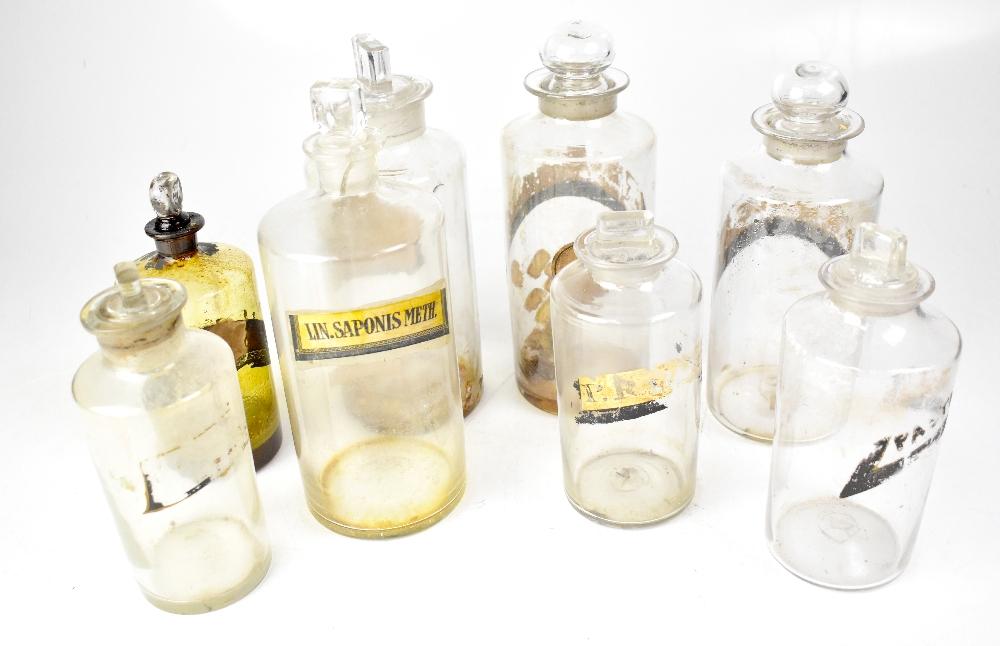 Lot 77 of 1102: PHARMACEUTICAL INTEREST; a group of early 20th century pharmaceutical bottles with stoppers, varying sizes, some with original labels and a group of stoneware jars from the same period (2). Provenance: This belonged to the vendor's father, who was a Liverpool pharmacist for many years from the 1950s onwards.