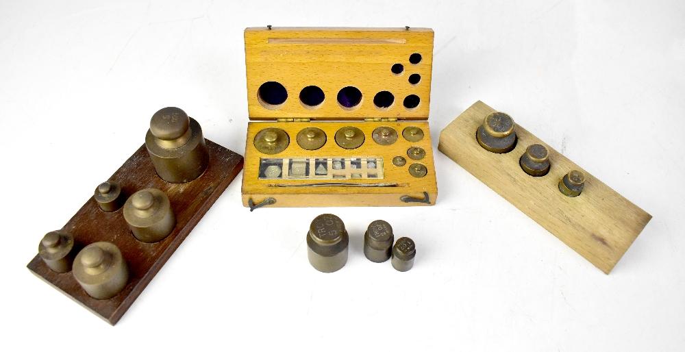 Lot 79 of 1102: PHARMACEUTICAL INTEREST; a c1930s boxed set of pharmaceutical weights, with tweezers, two sets of brass weights on oak boards and three separate weights. Provenance: This belonged to the vendor's father, who was a Liverpool pharmacist for many years from the 1930s onwards.