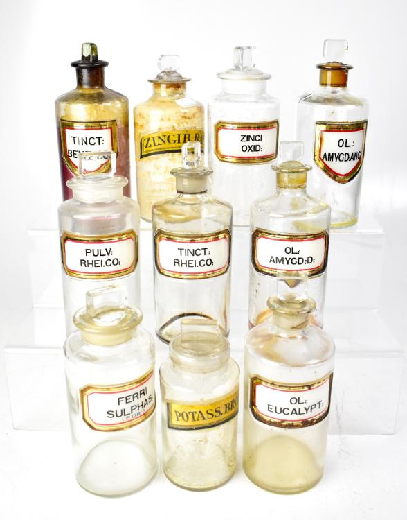 Lot 81 of 1102: PHARMACEUTICAL INTEREST; a group of early 20th century pharmaceutical jars and bottles, various sizes, some with original labels, most with original glass stoppers (2). Provenance: This belonged to the vendor's father, who was a Liverpool pharmacist for many years from the 1950s onwards.