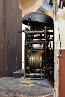 Lot 72A of 1102: HALLIWELL, WARRINGTON; a George III mahogany cased eight day long case clock, the broken swan neck pediment above arched painted dial, with rolling moon phase, the chapter ring set with Roman and Arabic numerals, with subsidiary seconds and day dial, above a shaped door flanked by quarter reeded pilasters, above a stepped plinth base, height 223cm.