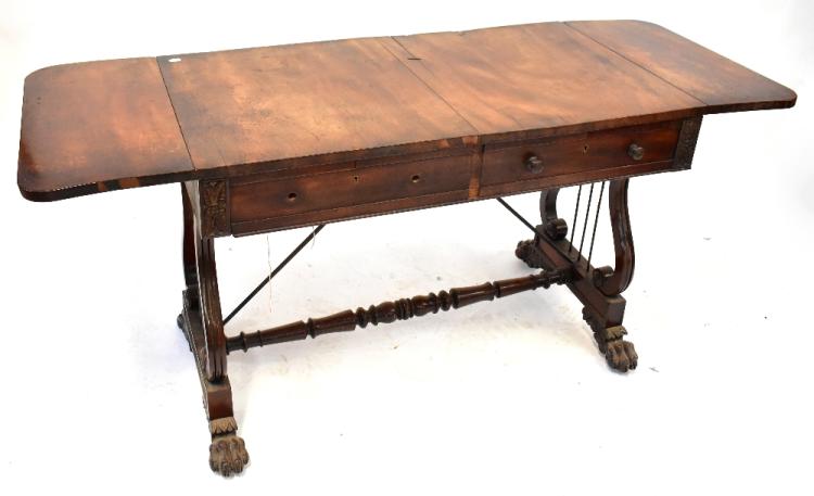 Lot 1 of 1181: A Regency mahogany sofa table with twin D-end flaps, above a pair of frieze drawers, with pair of faux drawer fronts opposite, raised on lyre supports to lion paw feet and castors, 72 x 107 x 59cm (unextended) (af).