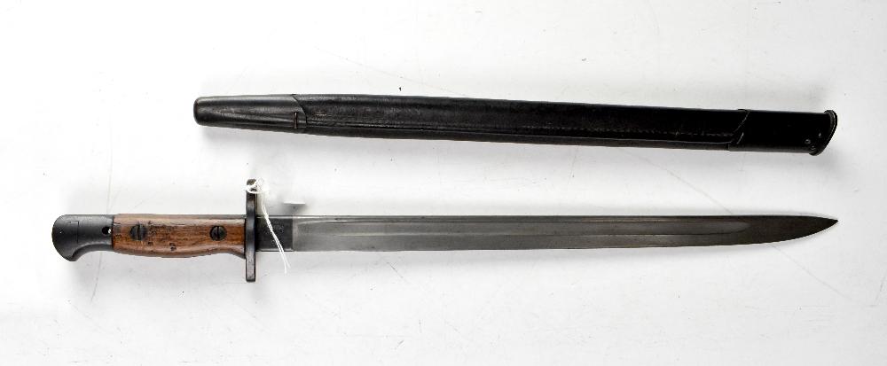 Lot 458A of 1181: A British 1907 pattern sword bayonet with leather scabbard, blade length 44.5cm, overall length 57cm.