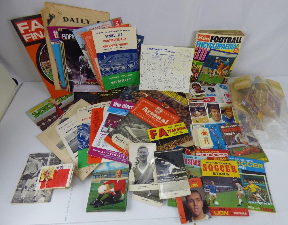 Lot 519 of 1181: A good quantity of football related items, to include football programmes, Final Tie between Burnley and Tottenham Hotspur May 5th 1962, with Wembley ticket, Burnley V Fulham Semi-Final Tie March 1962, John Hewie Testimonial Match 1965, Arsenal England V Young England 64/65, with additional play programme, various Claret and Blue, Football Encyclopaedia with metallic 3D Soccer Star cards, Ty-Phoo football player cards, various Soccer Star football albums, mostly complete, some bearing signatures