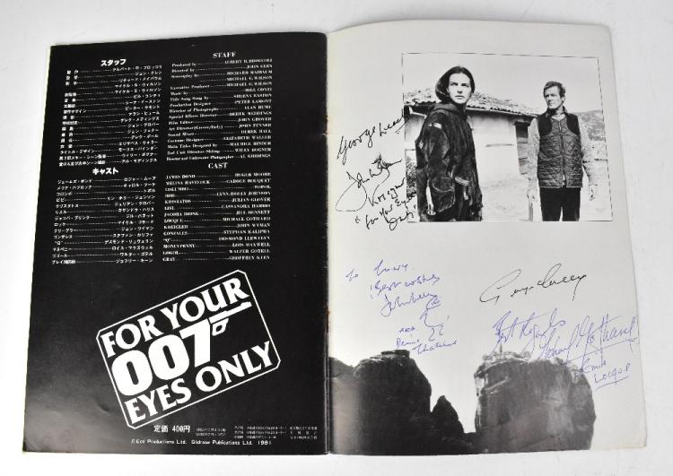 Lot 523 of 1181: JAMES BOND; a 'For Your Eyes Only' Japanese souvenir programme, bearing the signatures of Julian Glover, Lynn Holly Johnson, Cassandra Harris, Carole Bouquet, Seena (sic) Easton, John Glen, Bill Conti, Michael G Wilson, Kim Mills, Vanya, etc. We have not authenticated these signatures, please satisfy yourself as to the veracity of the item prior to bidding.