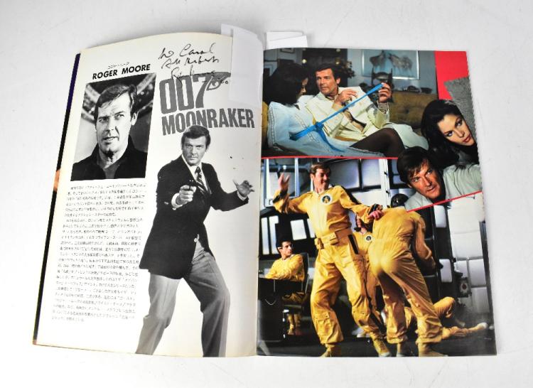 Lot 524 of 1181: JAMES BOND; a 'Moonraker' Japanese souvenir programme, bearing the signatures of Roger Moore, Michael Lonsdale (Drax), Cubby Broccoli, Lewis Gilbert, John Barry, Richard Kiel (Jaws), etc. We have not authenticated these signatures, please satisfy yourself as to the veracity of the item prior to bidding.