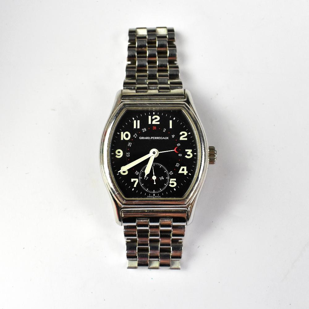 Lot 1130 of 1181: GIRARD; a gentlemen's stainless steel cased Perregaux automatic wristwatch, the black dial set with smaller seconds dial, on a stainless steel bracelet strap.