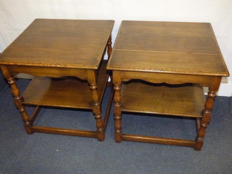 Lot 28 of 1231: A pair of reproduction oak square-topped bedside tables with under shelf, vase turned supports and stretchers, 63 x 60 x 60cm (2).