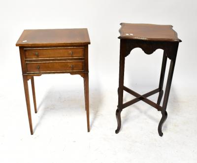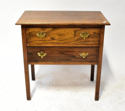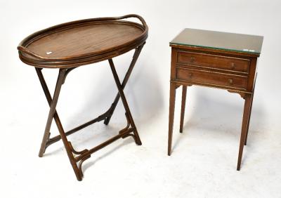 Lot 40 of 1231: A 19th century oak side table with two drawers, together with a pair of reproduction bedside tables, each with two drawers, an Edwardian-style mahogany side table with stop carved frieze and an Oriental bamboo folding tray table (5).
