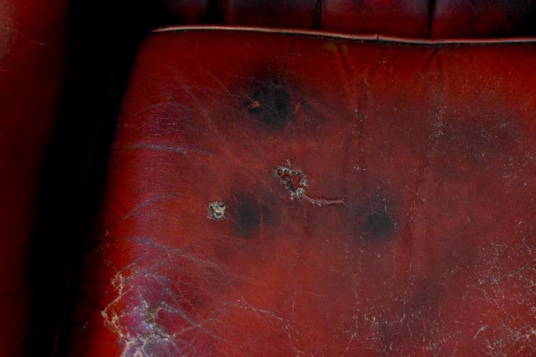 Lot 45 of 1231: A contemporary oxblood leather button pressed wing backed armchair, raised on cabriole supports to pad feet.