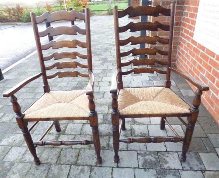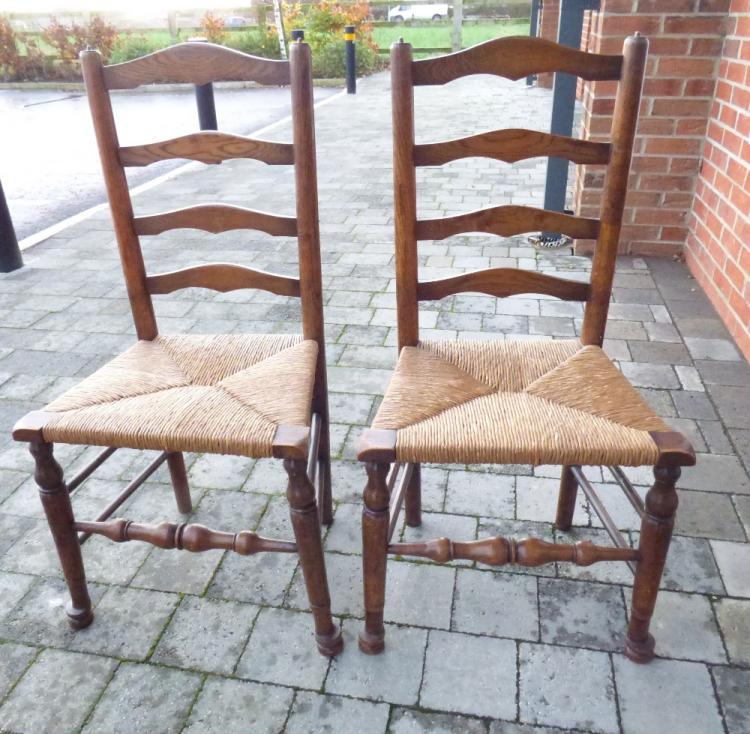 Lot 52 of 1231: A harlequin set of five 20th century ladder back rush seated chairs comprising a pair of six rung back Lancashire carvers, rush seat to turned front supports, a pair of four rung back Lancashire rush seated chairs with bobbin turned supports and a three rung back, rush seated dainty chair (5).